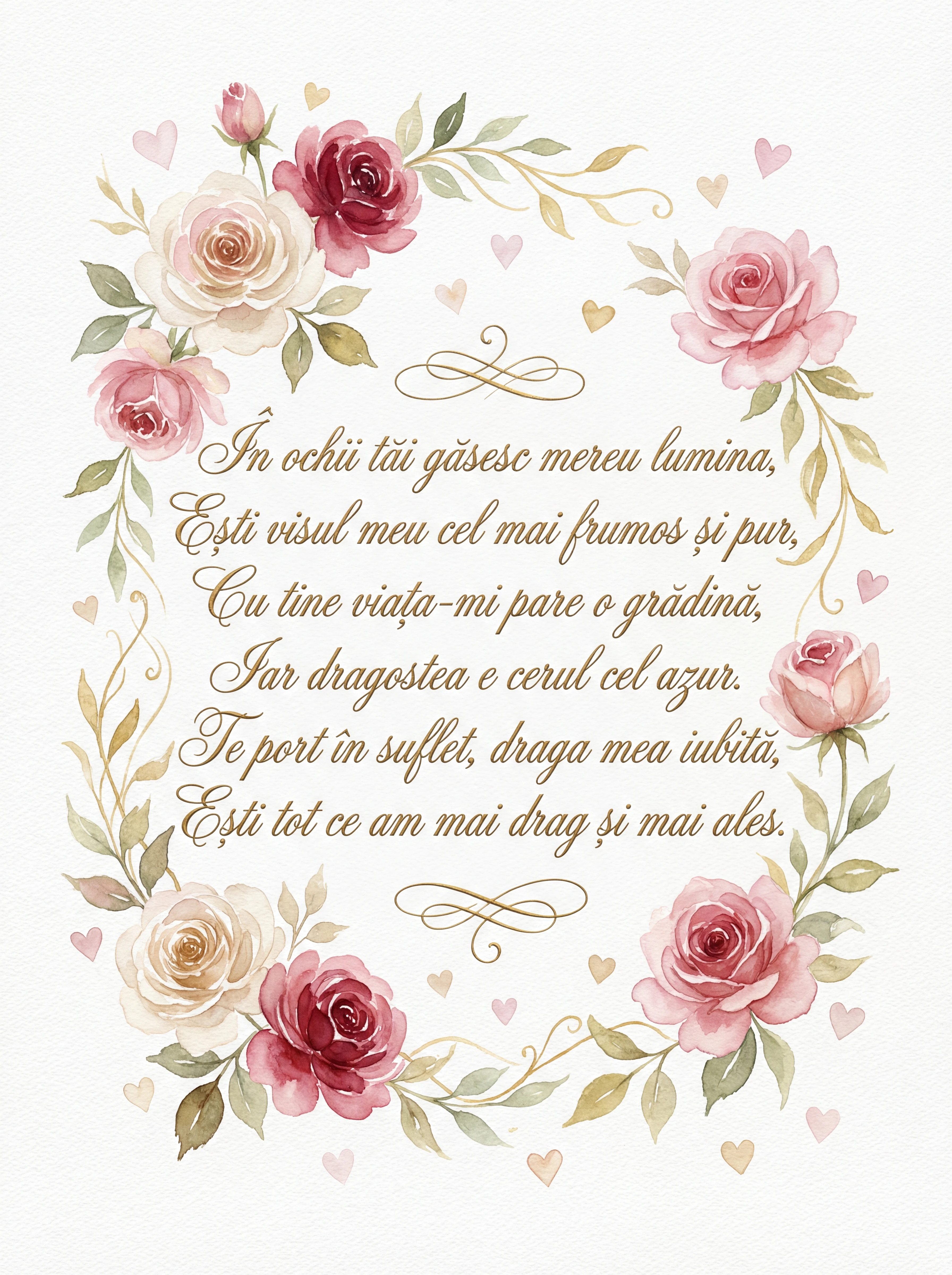 În ochii tăi găsesc mereu lumina, Ești visul meu cel mai frumos și pur, Cu tine viața-mi pare o grădină, Iar dragostea e cerul cel azur. Te port în suflet, draga mea iubită, Ești tot ce am mai drag și mai ales.