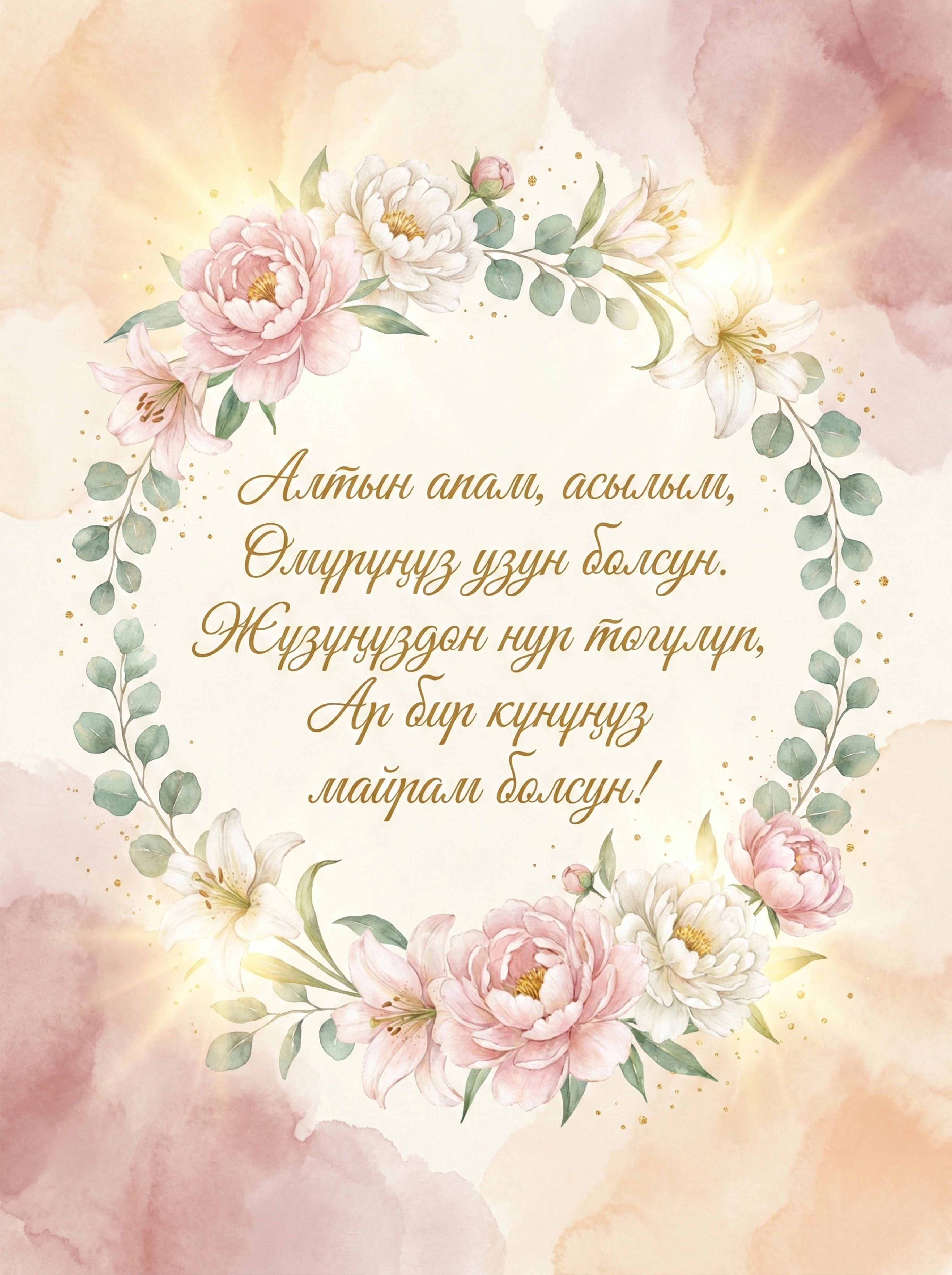 Алтын апам, асылым, Өмүрүңүз узун болсун. Жүзүңүздөн нур төгүлүп, Ар бир күнүңүз майрам болсун!