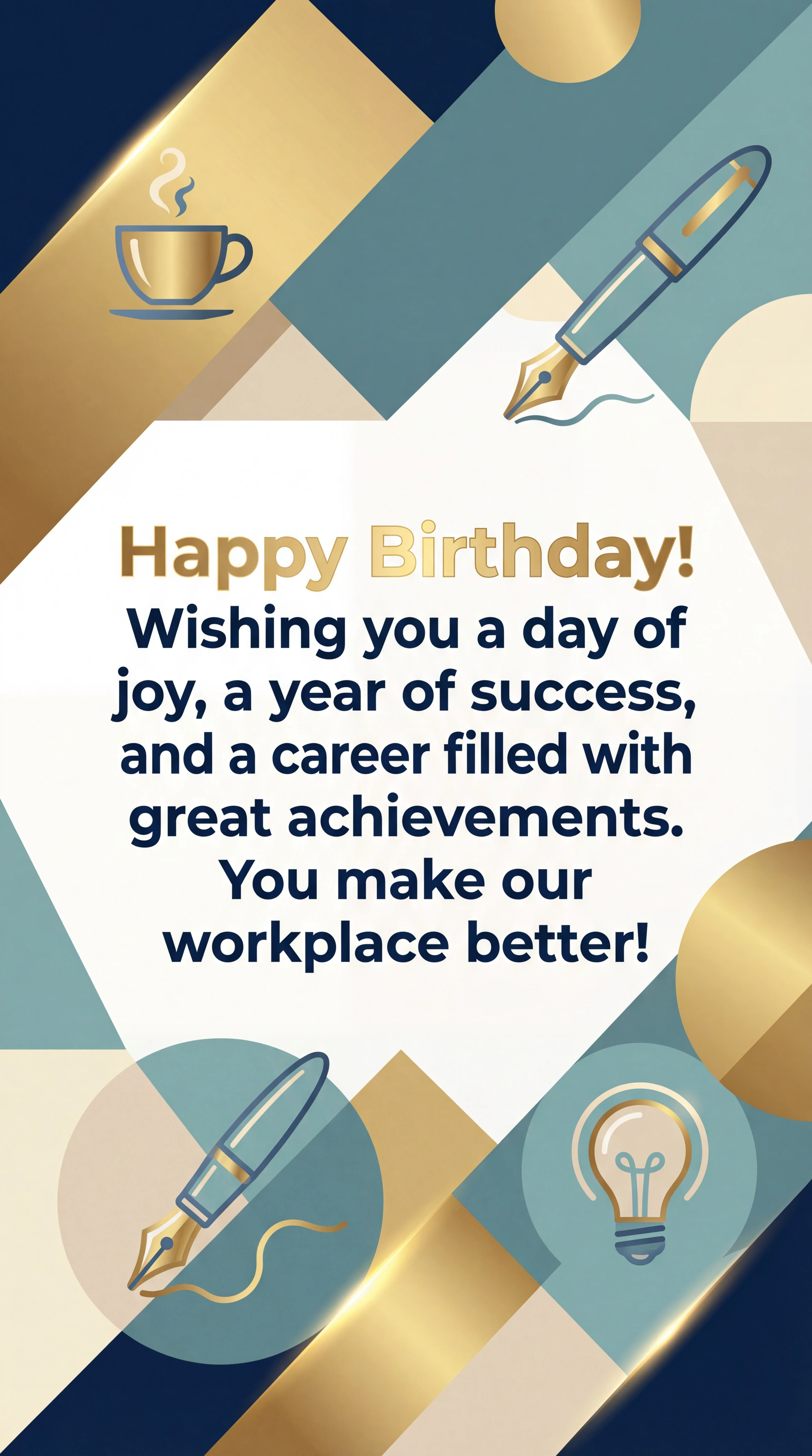 Happy Birthday! Wishing you a day of joy, a year of success, and a career filled with great achievements. You make our workplace better!