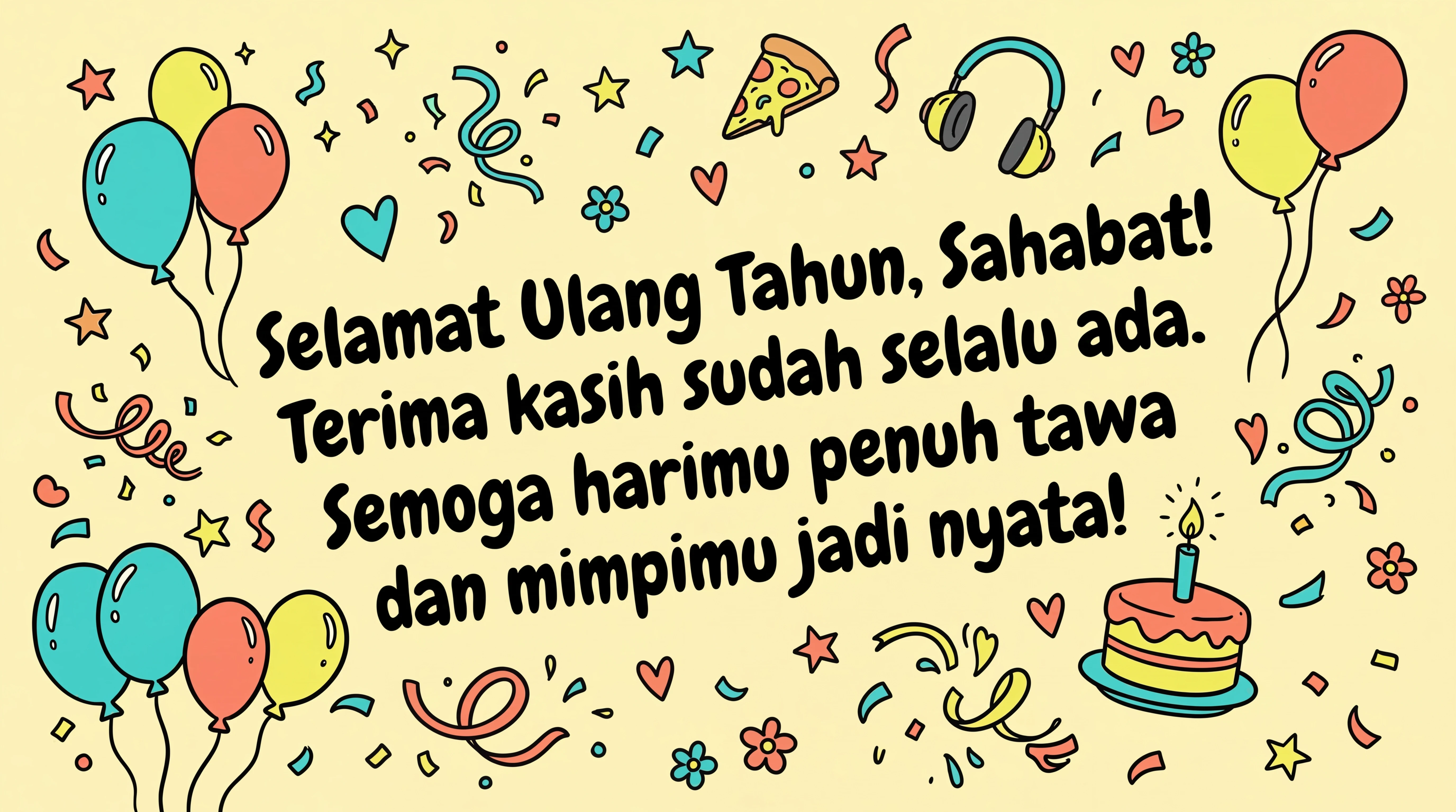 Selamat Ulang Tahun, Sahabat! Terima kasih sudah selalu ada. Semoga harimu penuh tawa dan mimpimu jadi nyata!