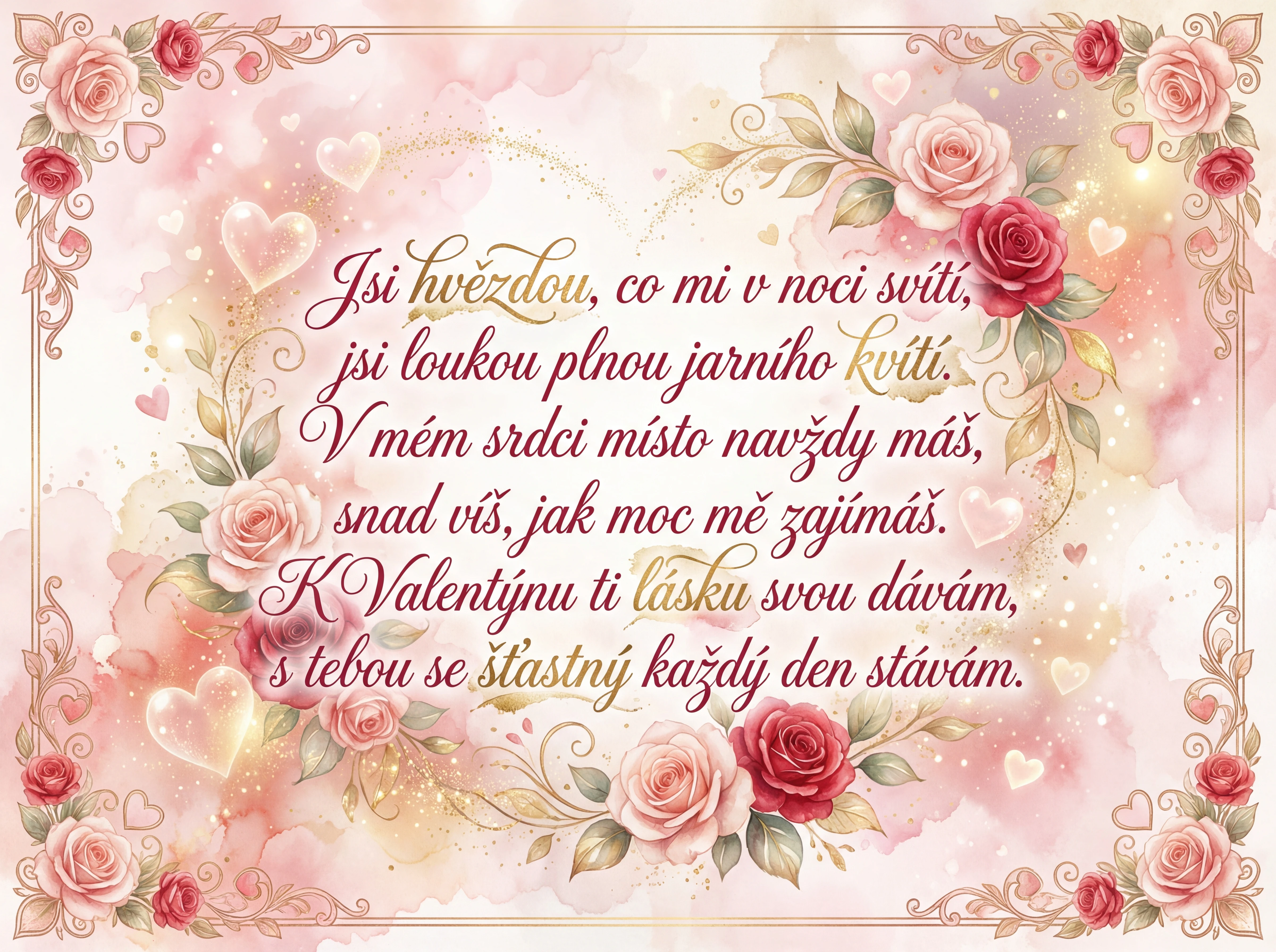 Jsi hvězdou, co mi v noci svítí, jsi loukou plnou jarního kvítí. V mém srdci místo navždy máš, snad víš, jak moc mě zajímáš. K Valentýnu ti lásku svou dávám, s tebou se šťastný každý den stávám.