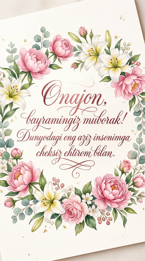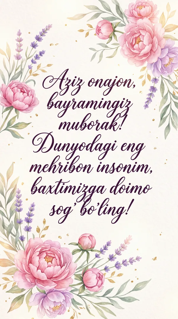 Bayramingiz bilan, aziz Onajon! Siz bizning baxtimiz, xonadonimiz nuri. Har doim sog' va omon bo'ling!
