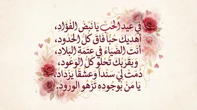 يا رفيقة دربي وأغلى ما لدي في عيد الحب أنتِ النور في عيني كل عام وأنتِ بقلبي ساكنة يا أجمل وردة في بستان عمري أحبكِ اليوم ودومًا يا حبيبتي يا من تملئين حياتي بالهنا والسكر