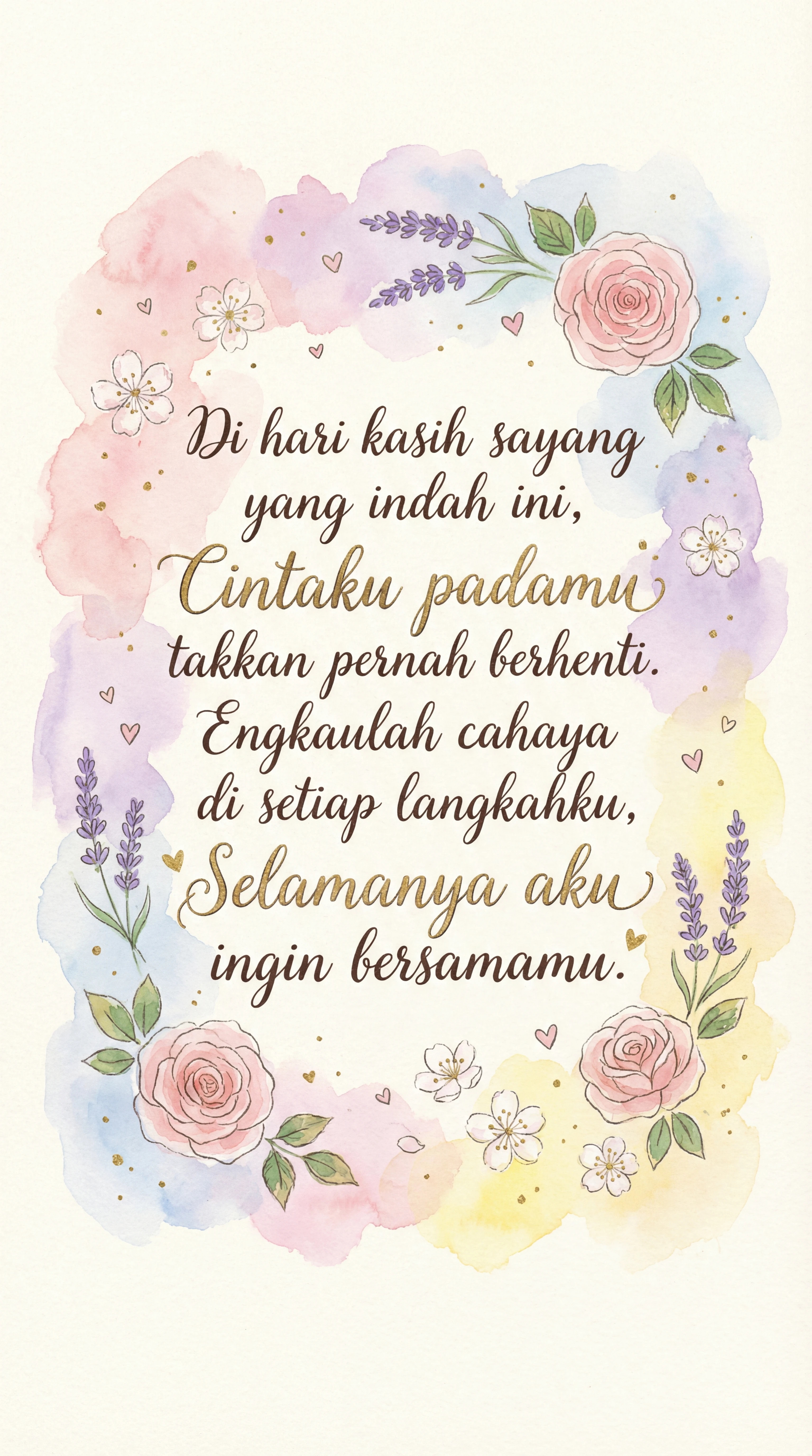 Di hari kasih sayang yang indah ini, Cintaku padamu takkan pernah berhenti. Engkaulah cahaya di setiap langkahku, Selamanya aku ingin bersamamu.