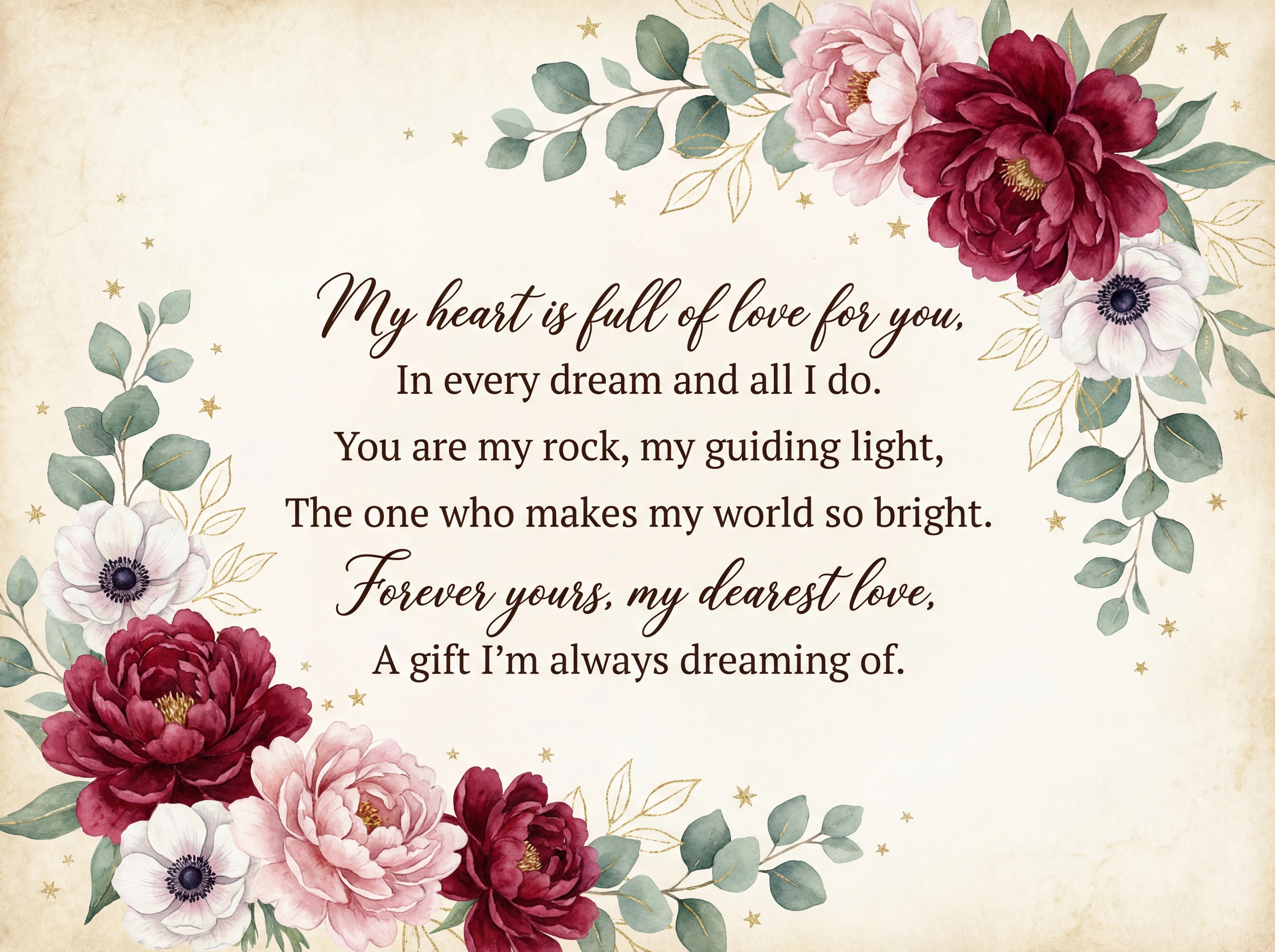 My heart is full of love for you, In every dream and all I do. You are my rock, my guiding light, The one who makes my world so bright. Forever yours, my dearest love, A gift I'm always dreaming of.
