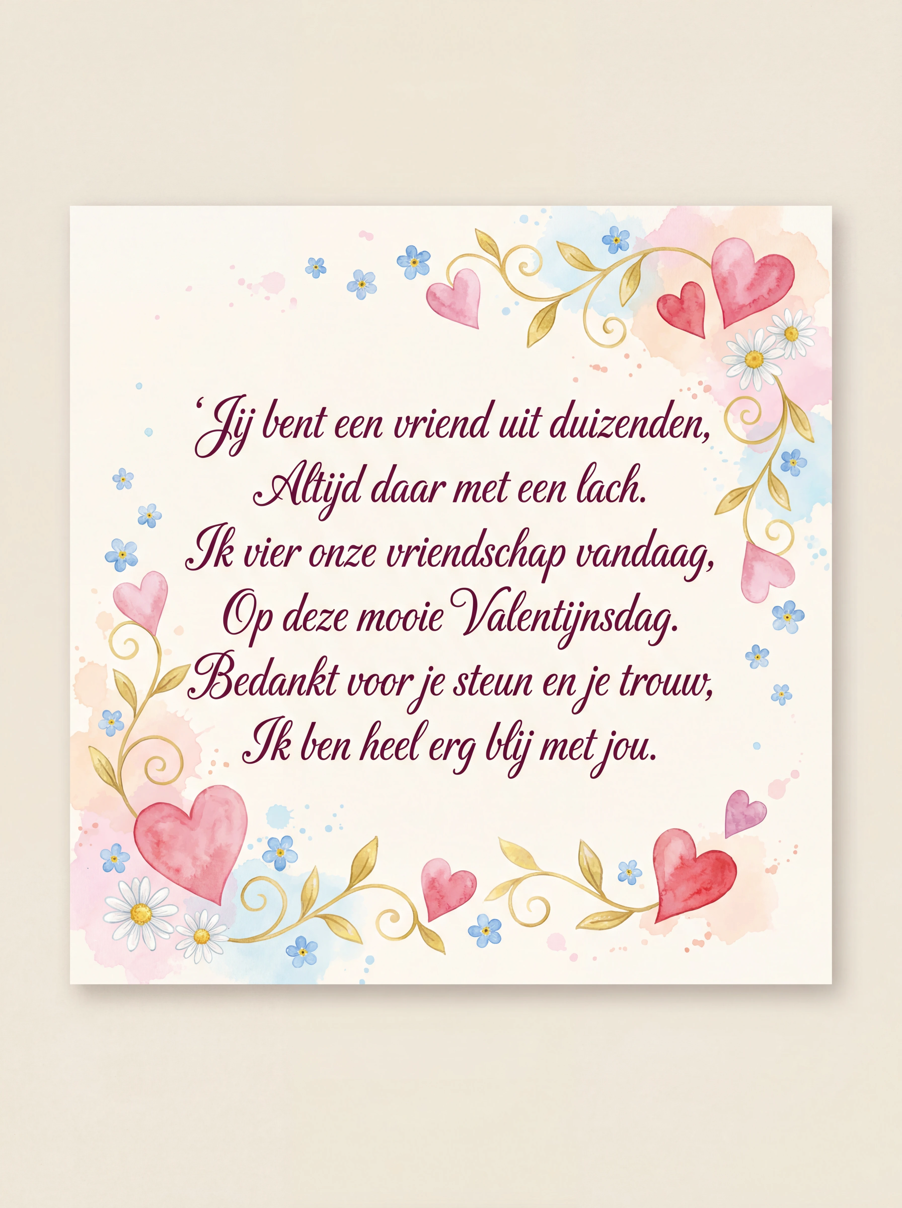Jij bent een vriend uit duizenden, Altijd daar met een lach. Ik vier onze vriendschap vandaag, Op deze mooie Valentijnsdag. Bedankt voor je steun en je trouw, Ik ben heel erg blij met jou.