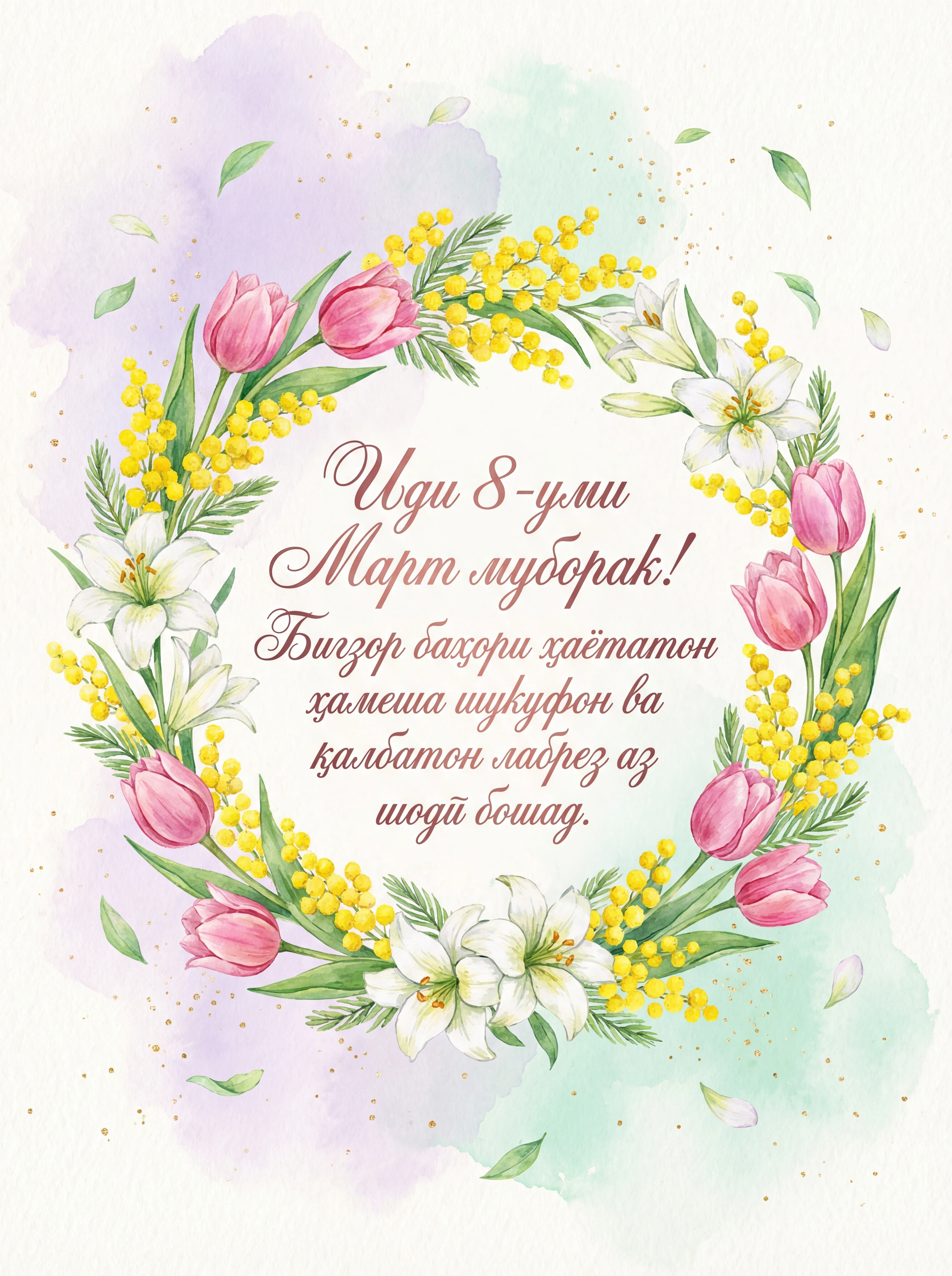Иди 8-уми Март муборак! Бигзор баҳори ҳаётатон ҳамеша шукуфон ва қалбатон лабрез аз шодӣ бошад.