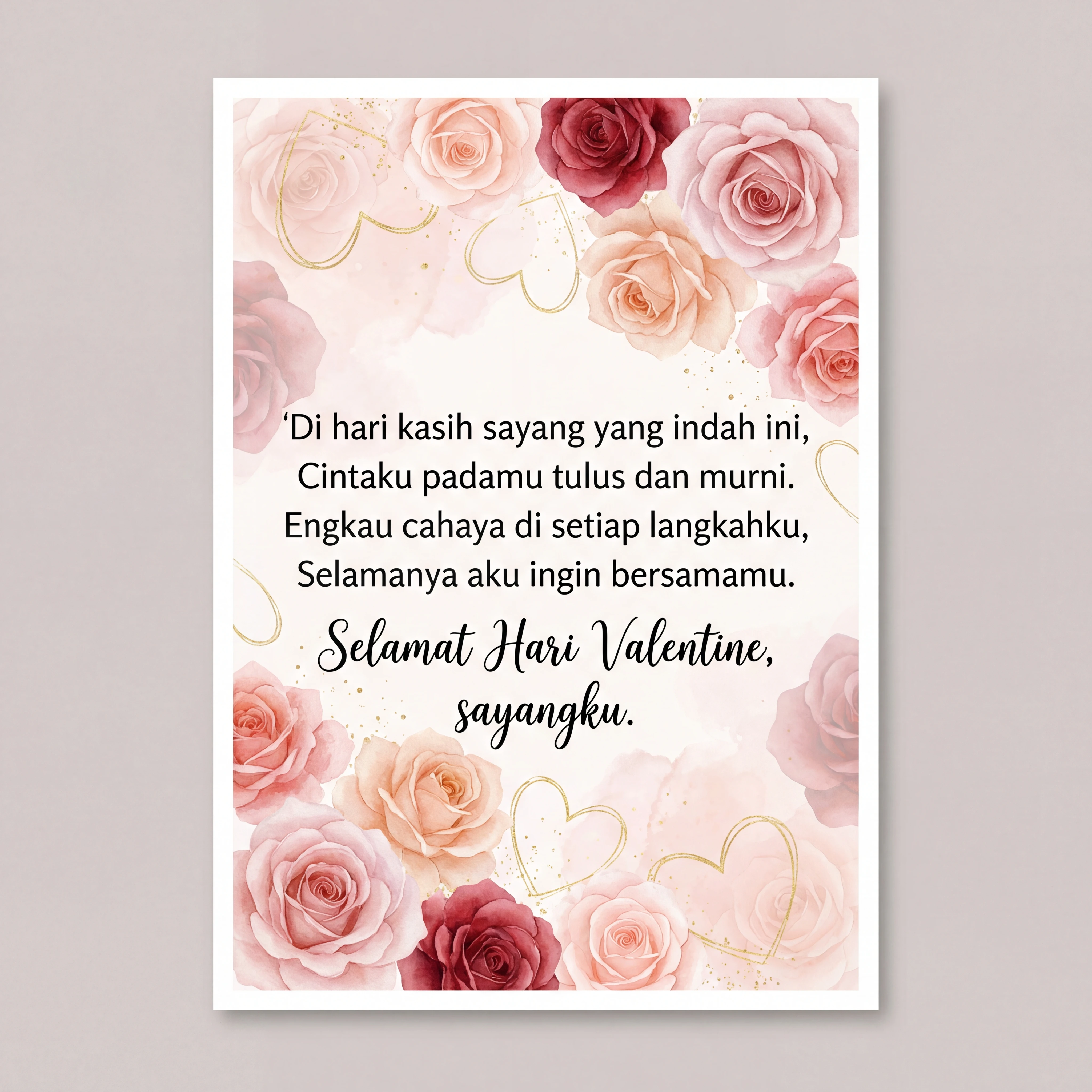 Di hari kasih sayang yang indah ini, Cintaku padamu tulus dan murni. Engkau cahaya di setiap langkahku, Selamanya aku ingin bersamamu. Selamat Hari Valentine, sayangku.