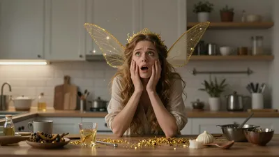 – Un génie magique transformant un ustensile de cuisine ordinaire avec de la poussière scintillante, créant une atmosphère féerique.
