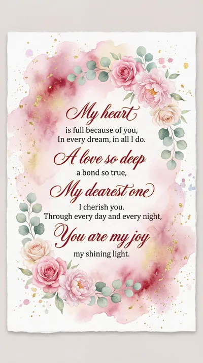 My heart is full because of you, In every dream, in all I do. A love so bright, a soul so kind, The greatest treasure I could find. Today and always, you're the one, My starlight and my morning sun.