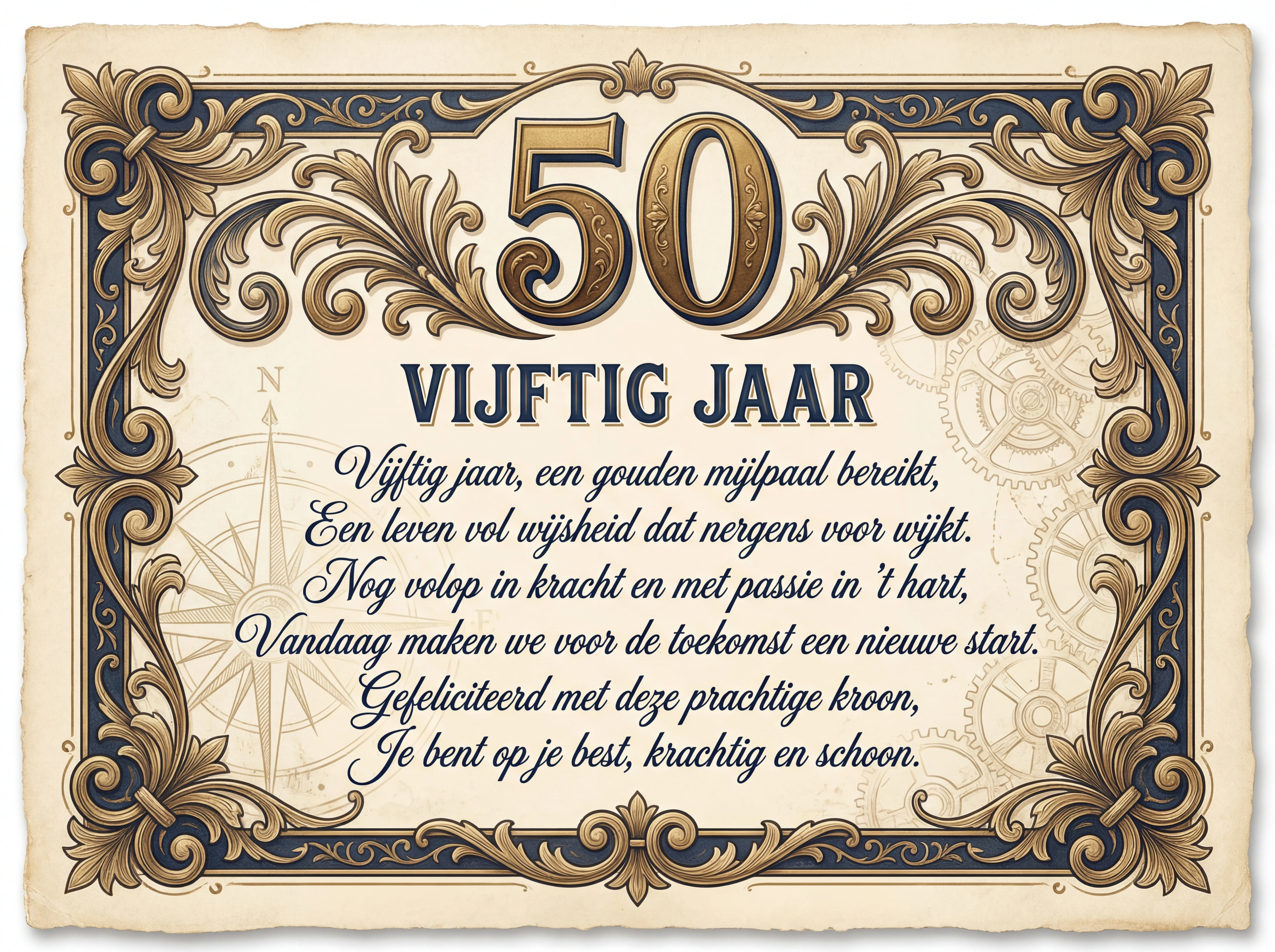 Vijftig jaar, een gouden mijlpaal bereikt, Een leven vol wijsheid dat nergens voor wijkt. Nog volop in kracht en met passie in 't hart, Vandaag maken we voor de toekomst een nieuwe start. Gefeliciteerd met deze prachtige kroon, Je bent op je best, krachtig en schoon.