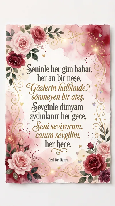 Gözlerinde buldum ben huzuru, Seninle her anım bir başka güzel. Kalbim seninle atar, hep dopdolu, Sevgin ömrüme en kıymetli ödül. Sevgililer Günümüz kutlu olsun.