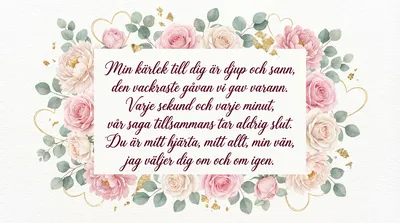 Du är mitt hjärta, mitt allt och min vän, Jag väljer dig om och om igen. Med kärlek så varm och en blick så klar, Är du den finaste skatt som jag har.