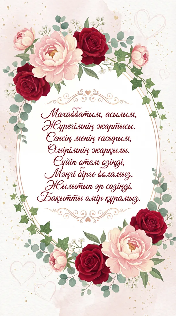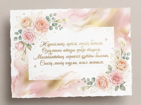 Махаббаттың нұрына бөленейік, Бақыттың базарына кенелейік. Әрқашан бірге болып, қол ұстасып, Өмірдің қызығын бір көрейік.