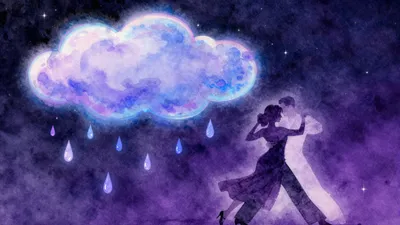– Seni cat air abstrak yang menampilkan langit malam biru tua dan ungu dengan bintang yang terang.