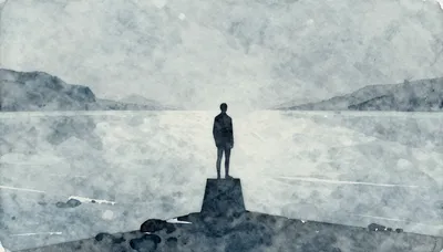 – Seni digital abstrak yang ditandai dengan nada biru/abu-abu dingin dan elemen tajam yang rapuh.
