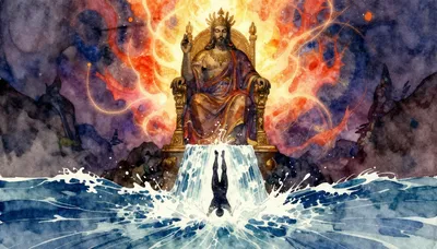 – Perairan gelap yang memantulkan cahaya, dikelilingi kabut dan elemen bercahaya yang penuh misteri.
