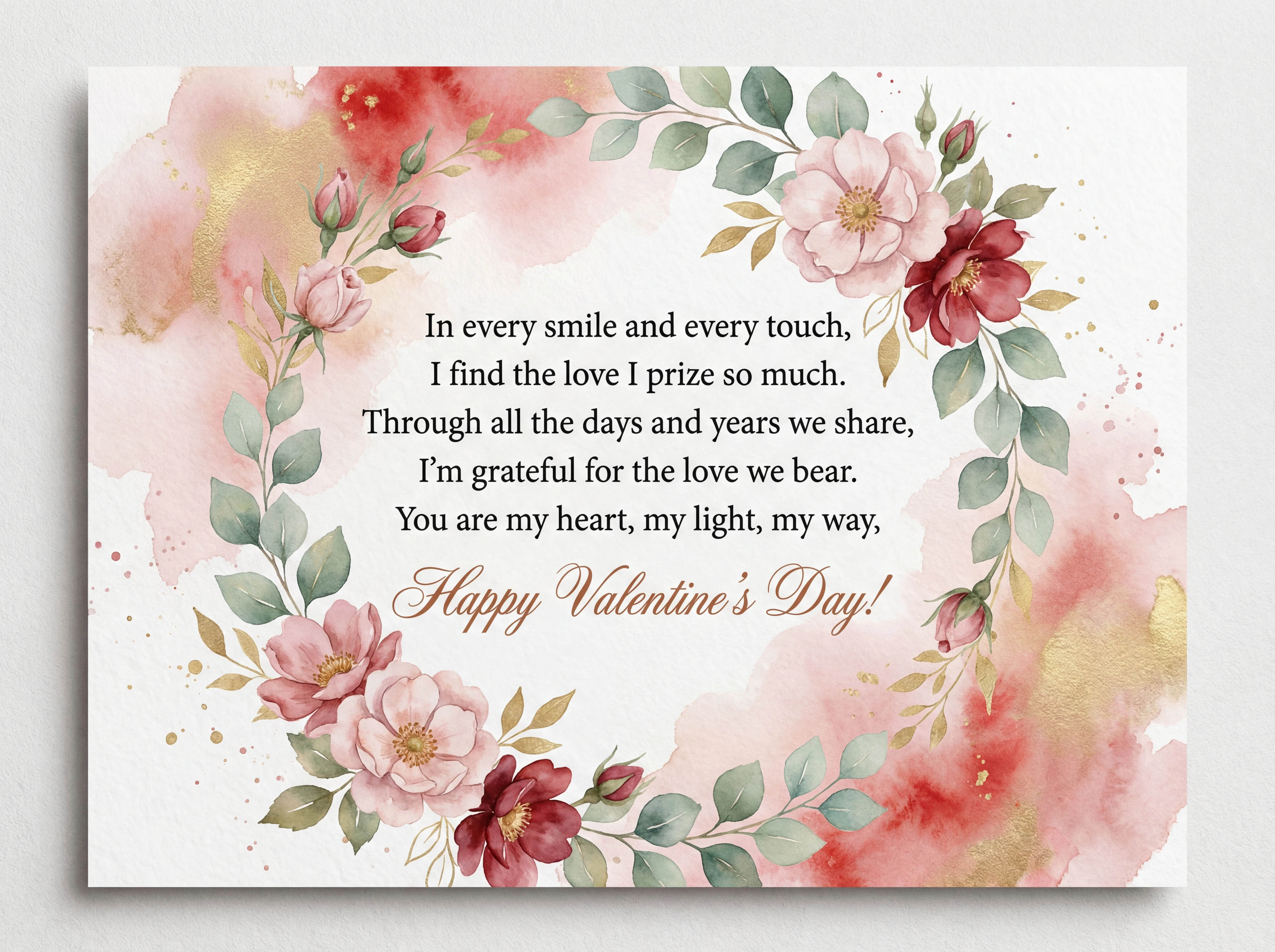 To the one who holds my heart so dear, With you, the world is bright and clear. Through every season, hand in hand, The greatest love across the land. Happy Valentine's Day, my love.