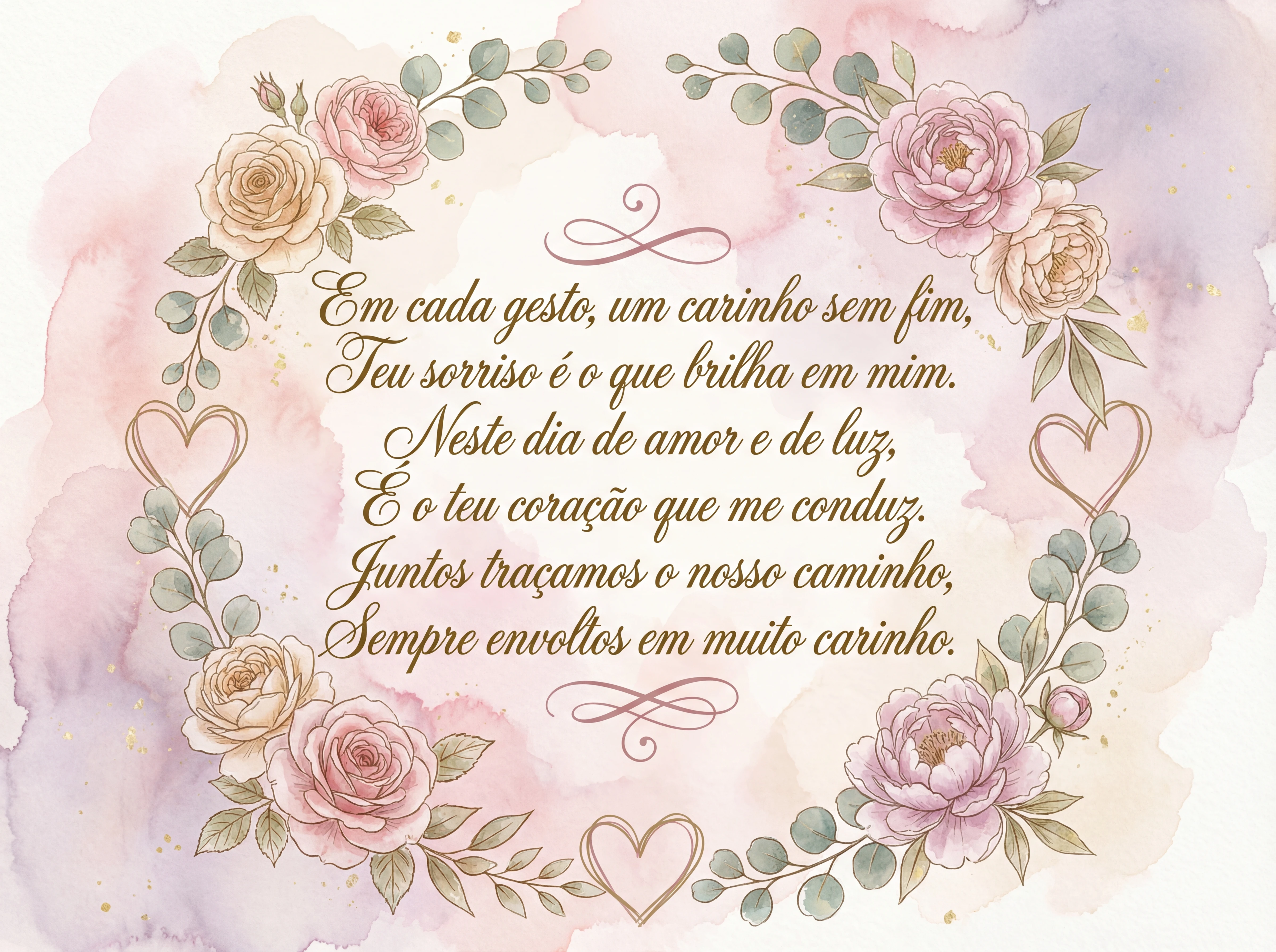 Em cada gesto, um carinho sem fim, Teu sorriso é o que brilha em mim. Neste dia de amor e de luz, É o teu coração que me conduz. Juntos traçamos o nosso caminho, Sempre envoltos em muito carinho.