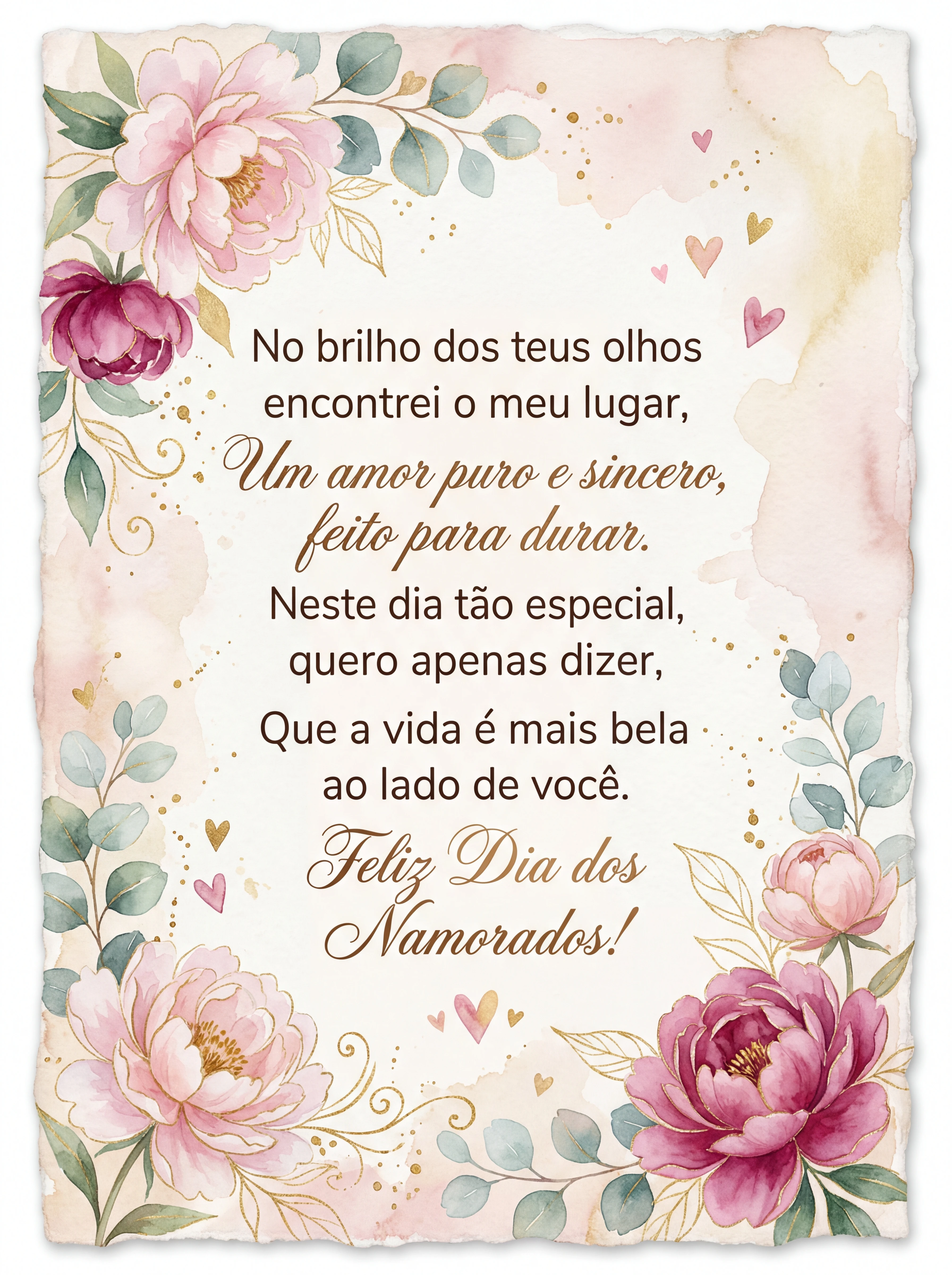 No brilho dos teus olhos encontrei o meu lugar, Um amor puro e sincero, feito para durar. Neste dia tão especial, quero apenas dizer, Que a vida é mais bela ao lado de você. Feliz Dia dos Namorados!