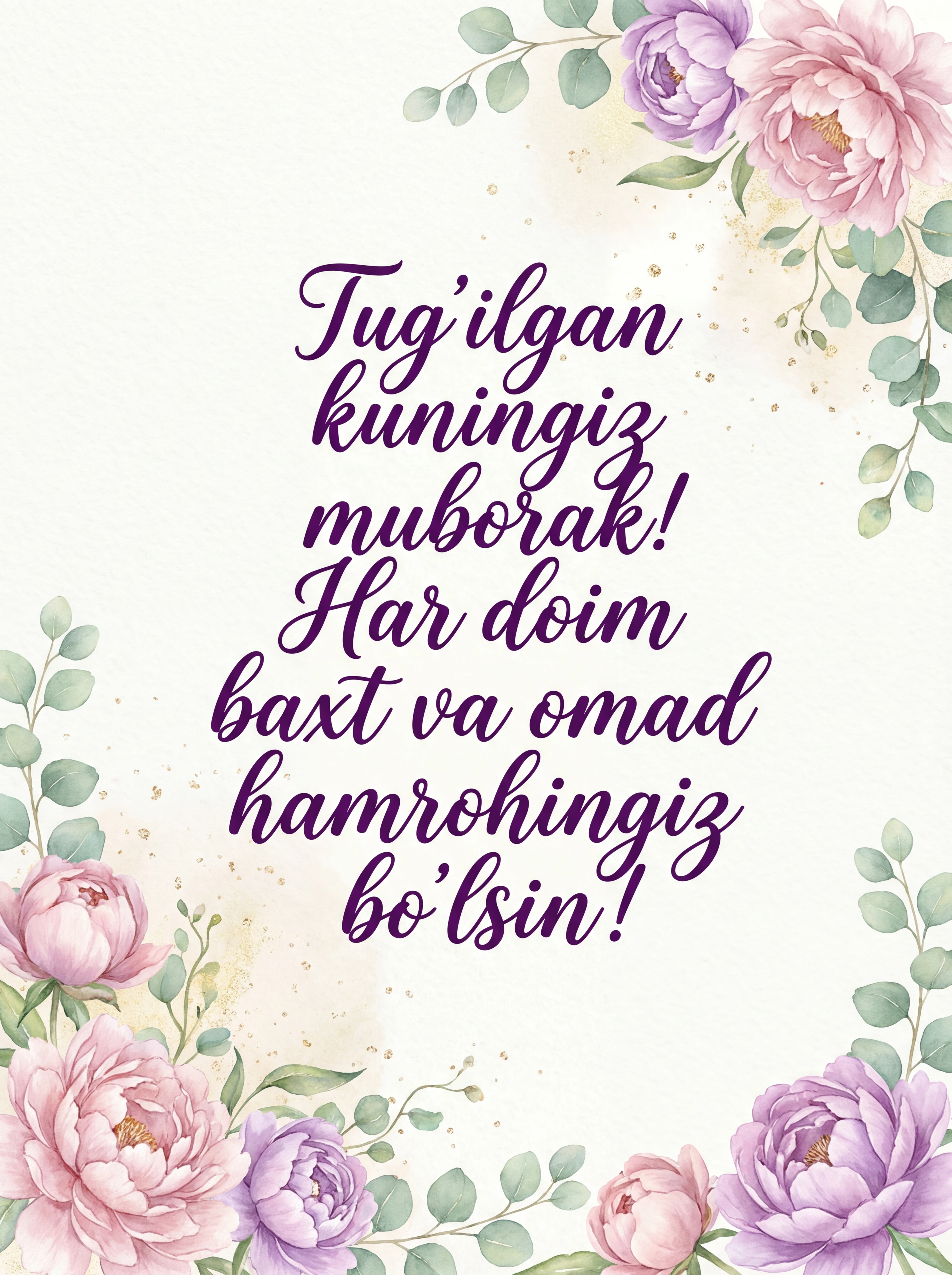Tug'ilgan kuningiz muborak! Har doim baxt va omad hamrohingiz bo'lsin!