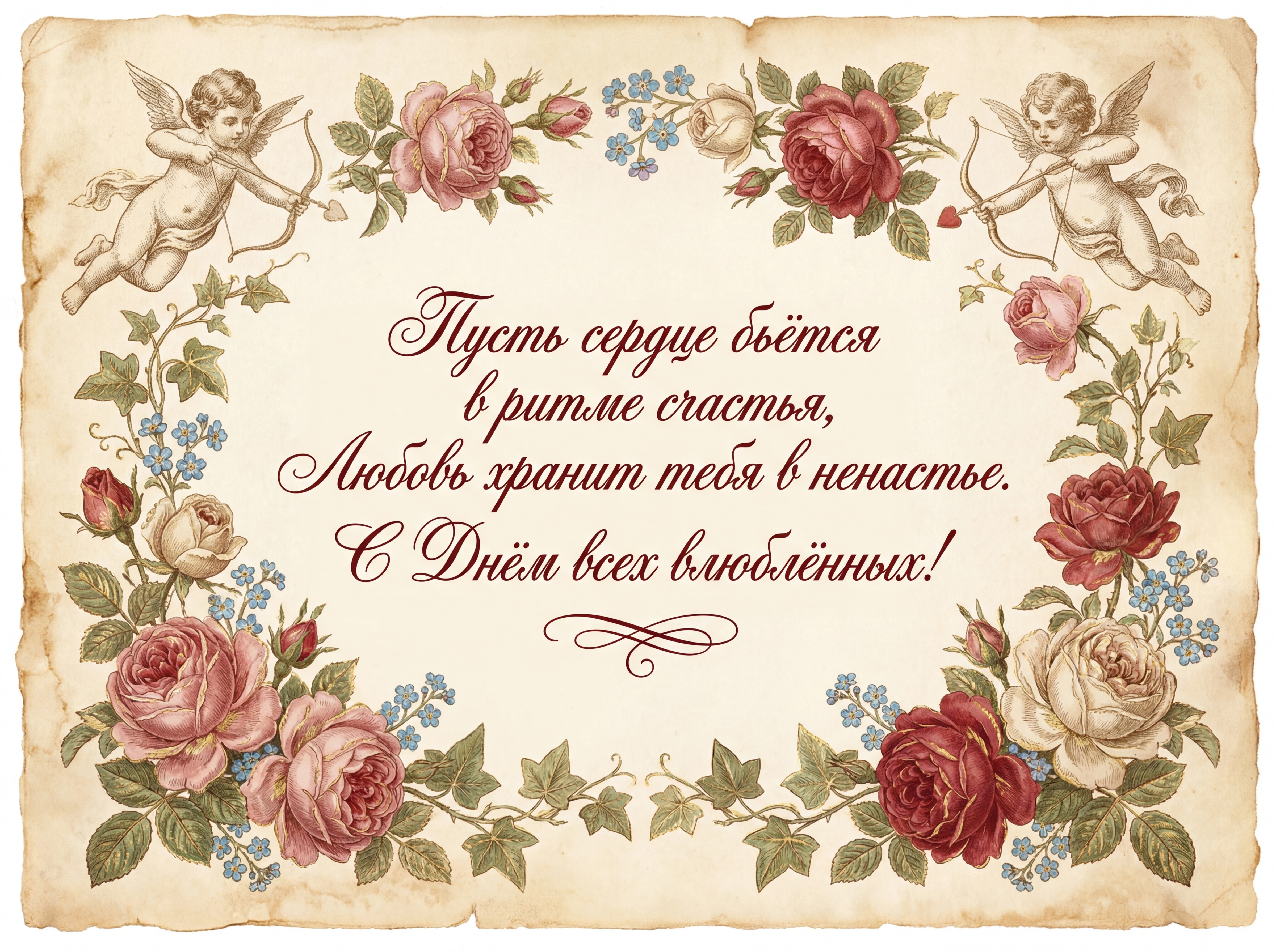 Пусть сердце бьётся в ритме счастья, Любовь хранит тебя в ненастье. С Днём всех влюблённых!