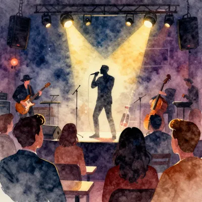 – Scena dinamica sul palco con musicisti in un club buio, che cattura l'energia vibrante di un concerto.