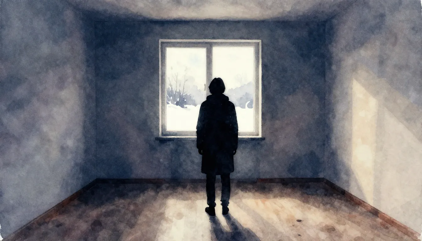 – Un paesaggio innevato e desolato con una casa solitaria, che evoca tristezza e riflessione.