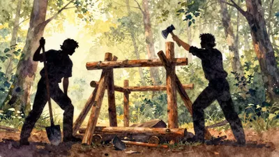 – Rappresentazione del lavoro tradizionale e della vita semplice in un contesto forestale con elementi industriali.