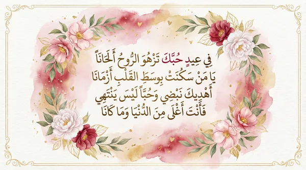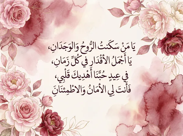 يا من سكنت القلب والروح والبال حبك في صدري يزهر كل حين كل عام وأنت لي خير الآمال يا نبض قلبي وأجمل العالمين في عيد الحب أهديك أشواقي فأنت النور في دربي واليقين