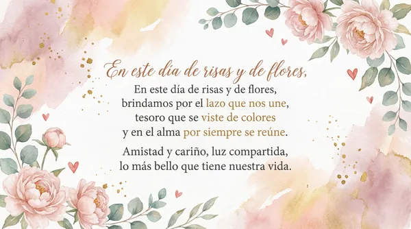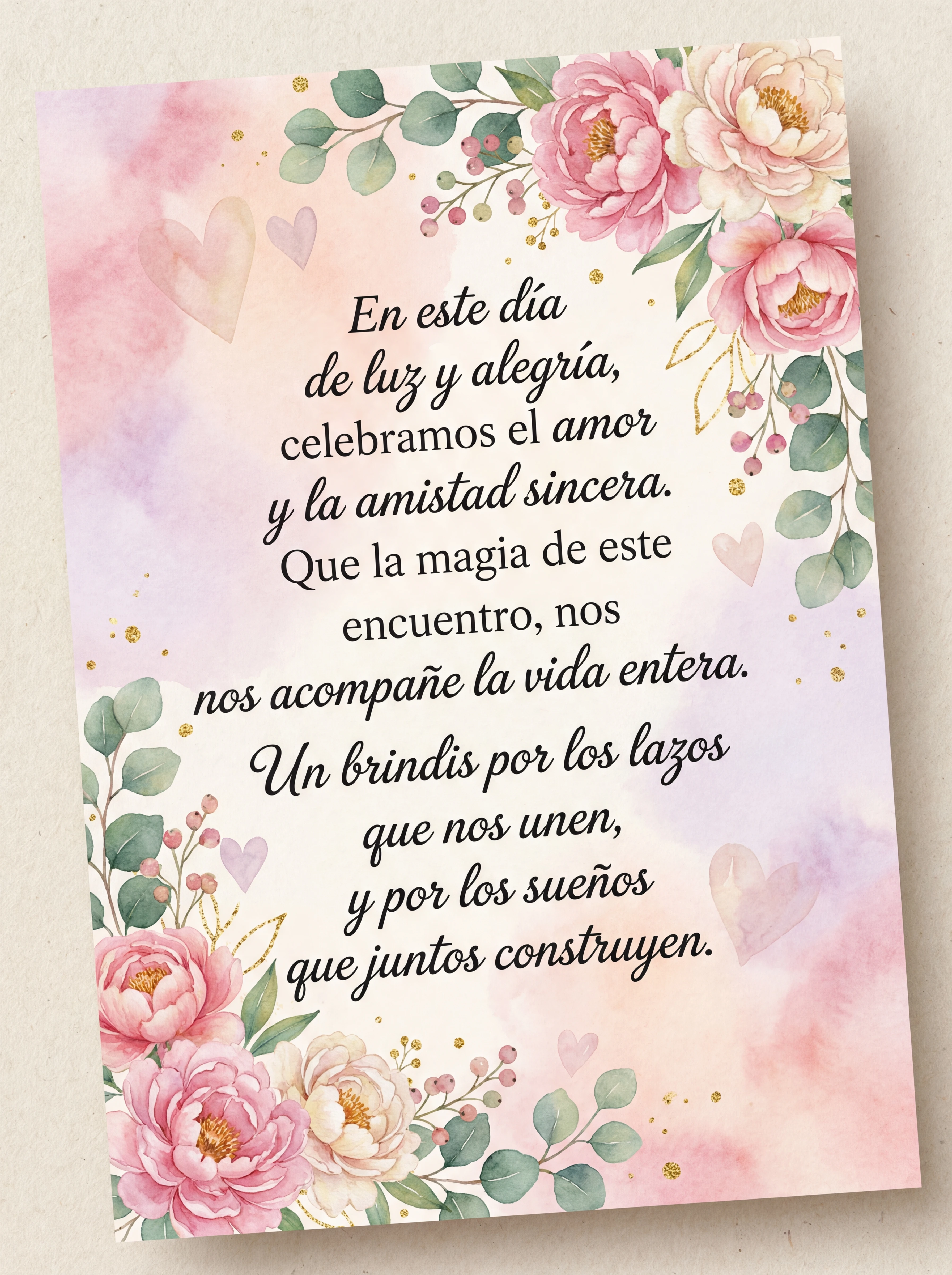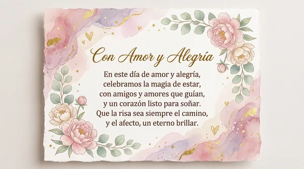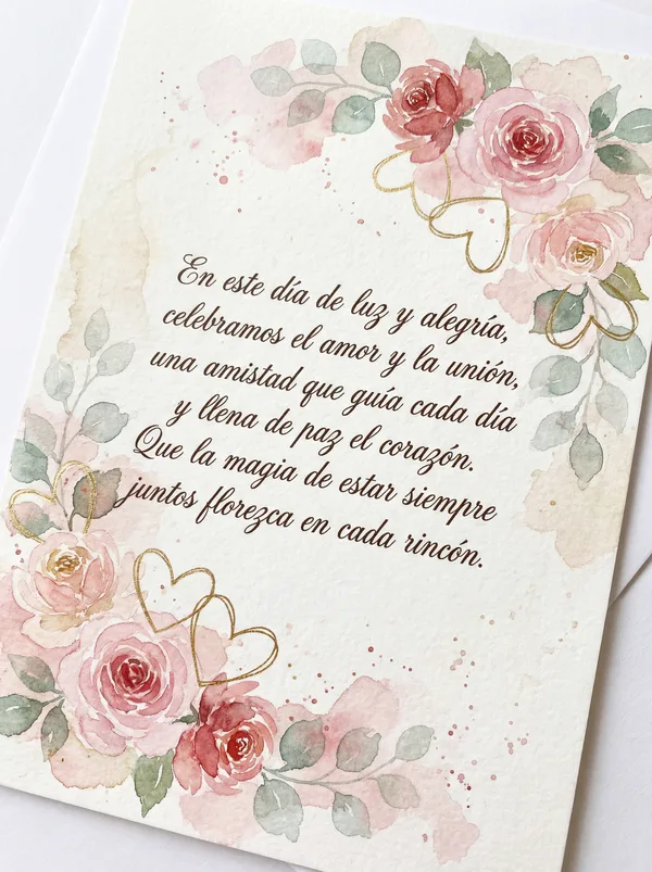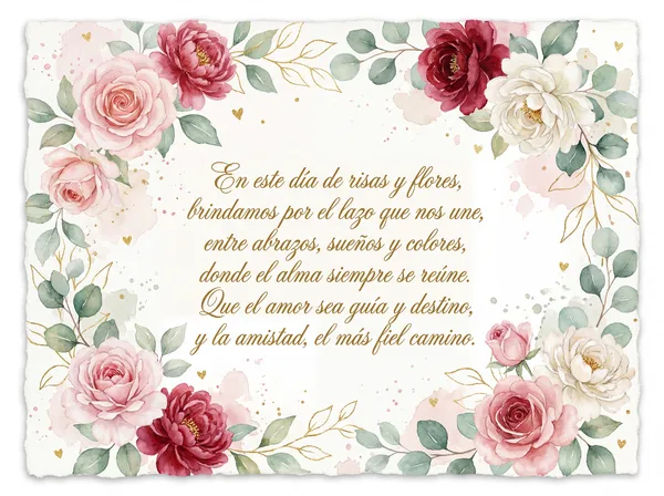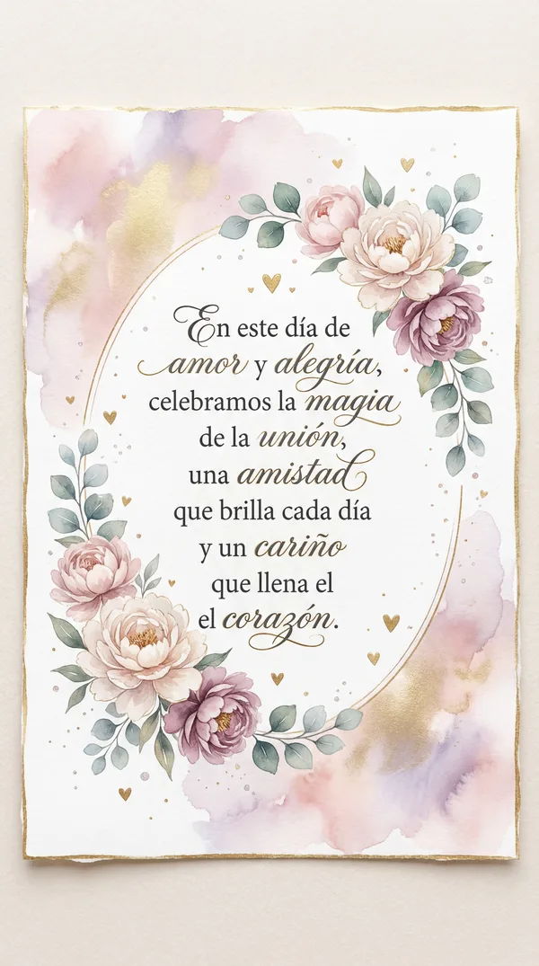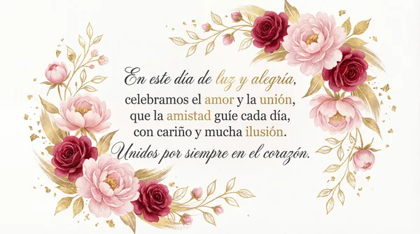 En este día de luz y alegría, celebramos el amor y la amistad sincera. Que la magia de este encuentro, nos acompañe la vida entera. Un brindis por los lazos que nos unen, y por los sueños que juntos construyen.