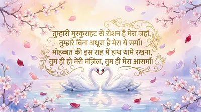 तुम्हारी मुस्कुराहट से रोशन है मेरा जहाँ, तुमसे ही शुरू और तुम पर ही खत्म मेरा आसमाँ। प्यार के इस सफर में तुम ही हो मेरी मंजिल, धड़कन बनकर तुम बसते हो मेरे इस दिल।