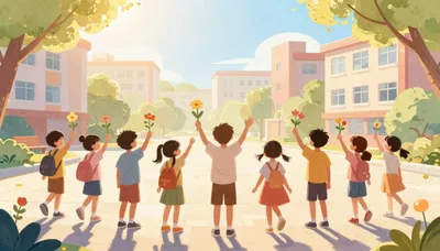 – Гүлдер мен табиғат аясындағы бақта ойнап жүрген балалар, таза ауа мен еркіндік.