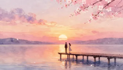– Толық ай мен шие гүлдерінің астындағы көпірдегі екі сұлбаның әсем көрінісі.