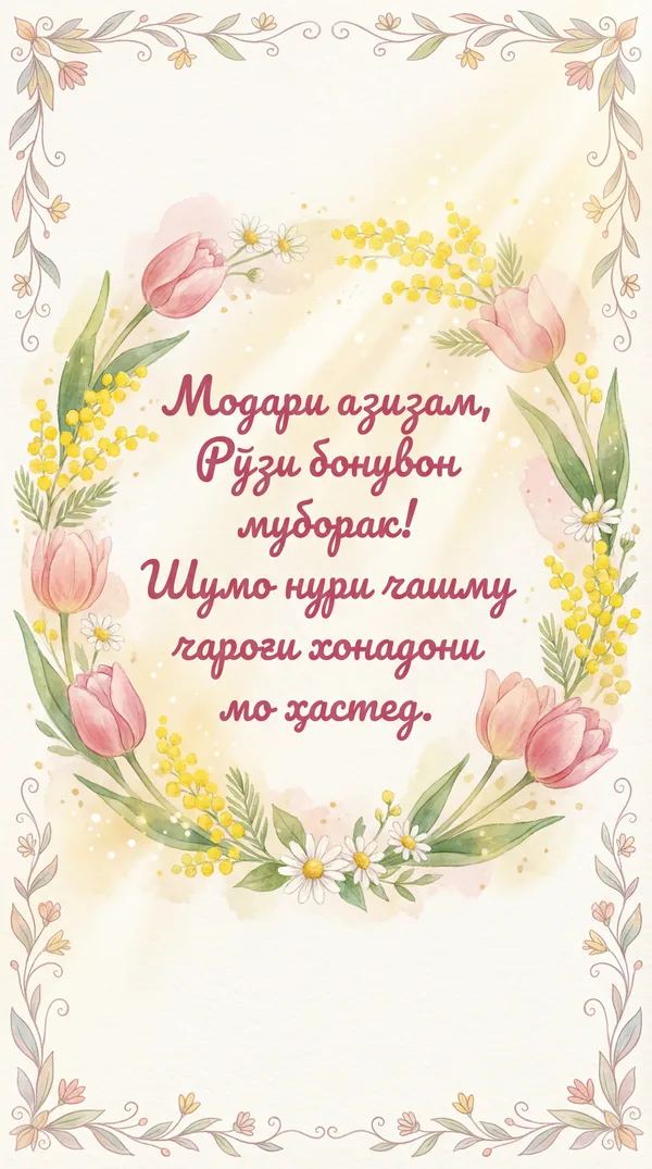 Модари азизам, Иди 8-уми Март муборак! Шумо нури чашмони мо ҳастед.