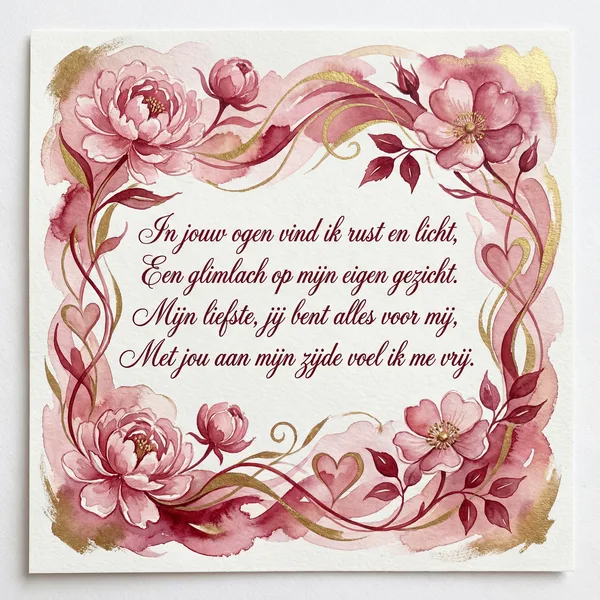 Liefde is wat ons verbindt, In alles wat ik in jou vind. Een hart vol warmte, teder en fijn, Ik ben zo blij dat wij samen zijn.