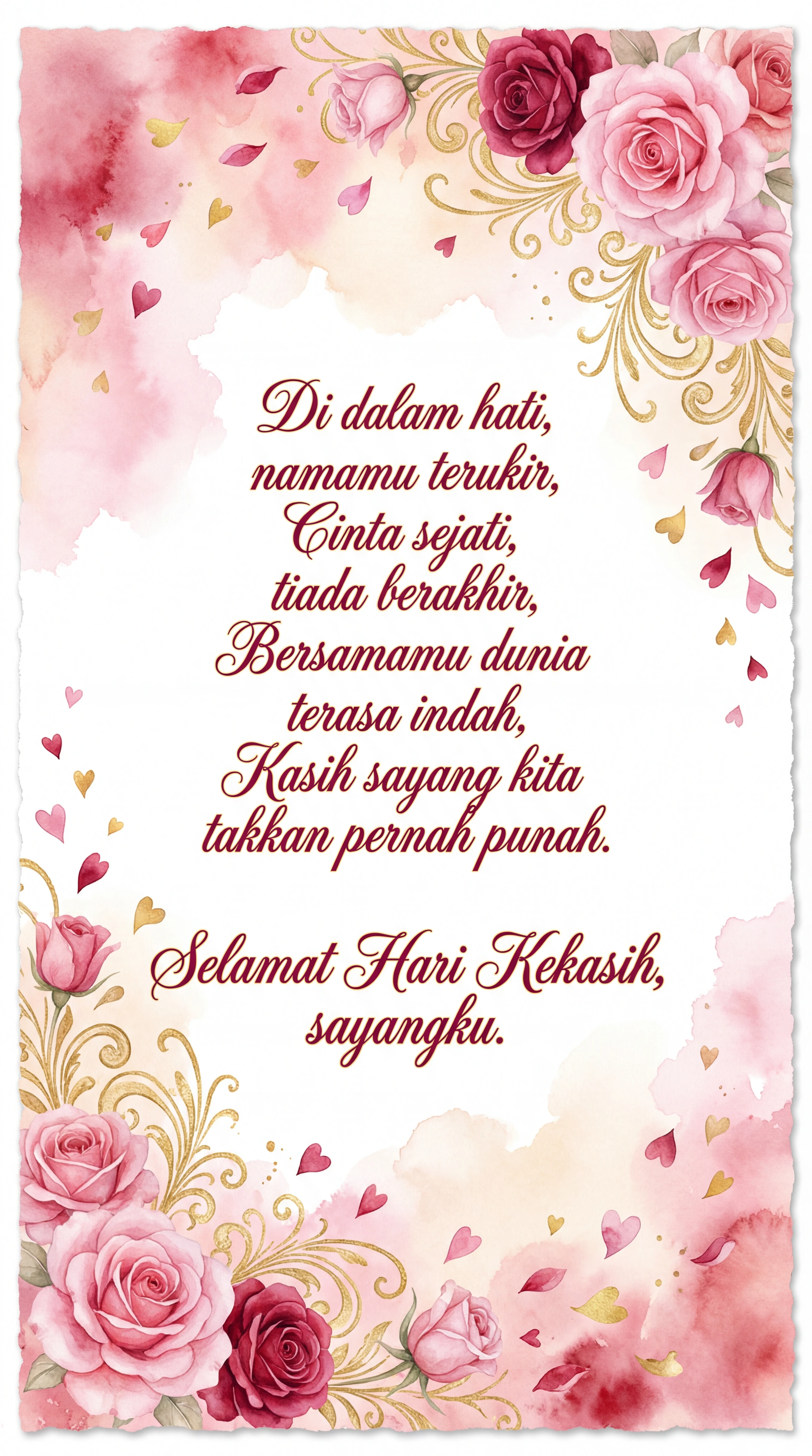 Di dalam hati, namamu terukir, Cinta sejati, tiada berakhir, Bersamamu dunia terasa indah, Kasih sayang kita takkan pernah punah. Selamat Hari Kekasih, sayangku.