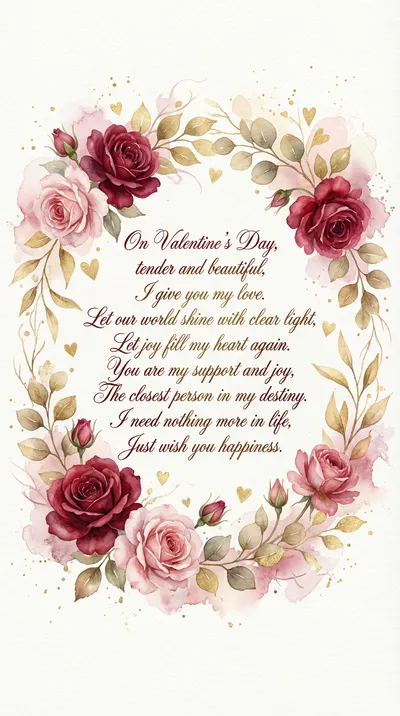 В день влюбленных, светлый и прекрасный, Пусть сердца стучат в один аккорд. Чувство наше будет вечно ясным, Словно самый нежный натюрморт. Я дарю тебе любовь и нежность, Пусть огонь в душе всегда горит. Счастье наше — это бесконечность, Что судьба обоим нам дарит.