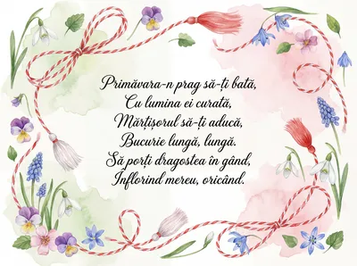 Primăvara-n prag să-ți bată, Cu o floare minunată, Mărțișorul să-ți aducă, Zâmbet, spor și voie bună. Să ai zile însorite, Și dorințe împlinite!