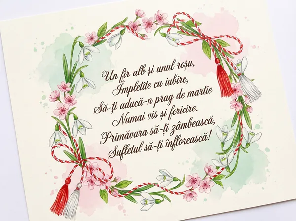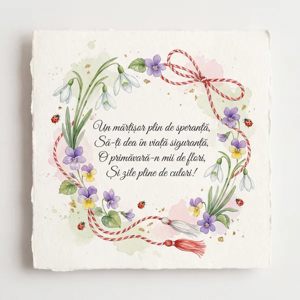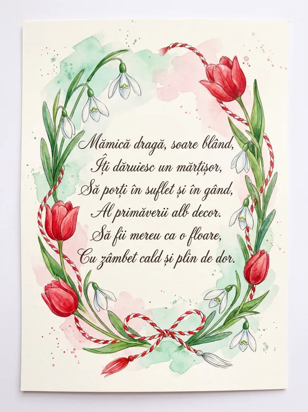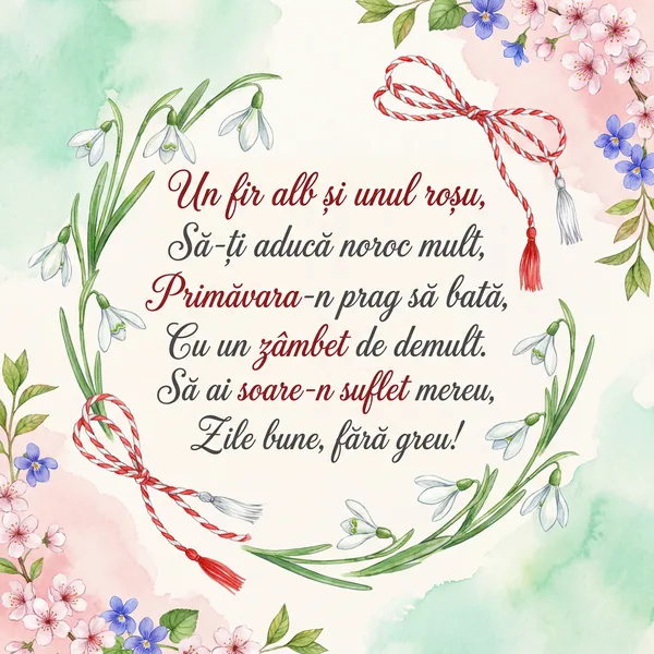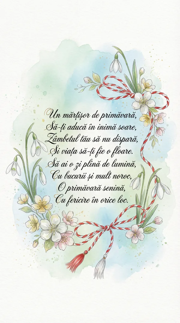 Un mărțișor în dar ți-aduc, Cu fir de alb și roșu-n ghem, Să-ți fie drumul plin de flori, Iar primăvara un poem. Să strălucești, prietena mea, Sub soarele cel blând și cald.