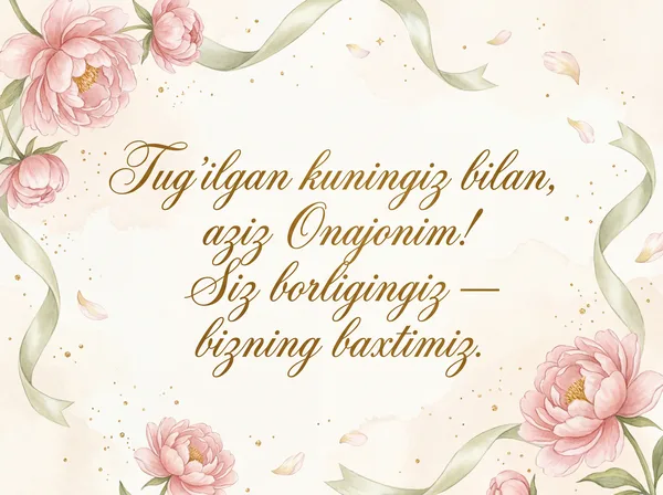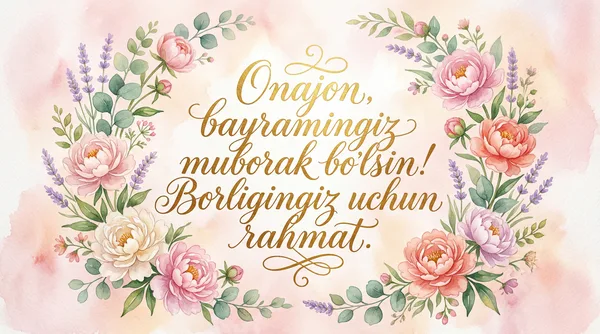 Dunyoda eng aziz insonim onam, Bayramingiz muborak bo'lsin! Doim sog' va baxtli bo'ling.