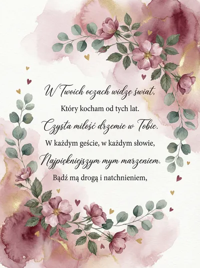 W Twoich oczach widzę cały świat, Najpiękniejszy w życiu dar. Niechaj miłość kwitnie setki lat, W sercu ogień, w duszy żar. Jesteś moim słońcem w każdy dzień, Z Tobą znika każdy smutku cień.