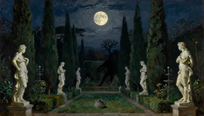 – Taman musim bunga yang indah pada waktu malam di bawah bulan purnama dengan bayang-bayang lembut dan bunga yang mekar.