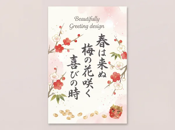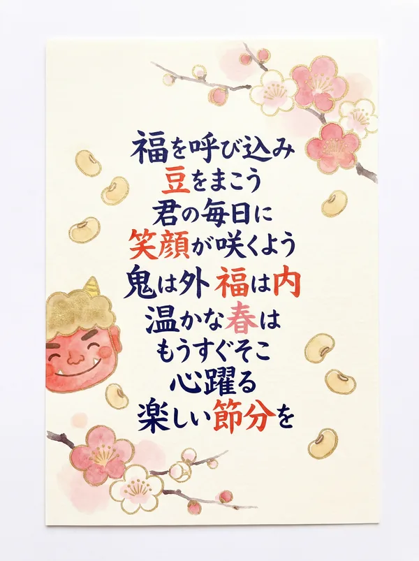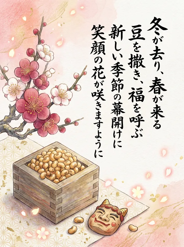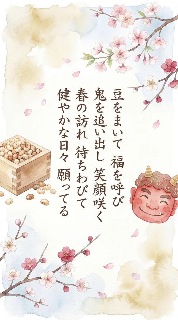 鬼は外、福は内 豆をまき、春を呼ぶ 災い払い、福を招き 笑顔咲く、健やかな日々 幸せが、訪れますように