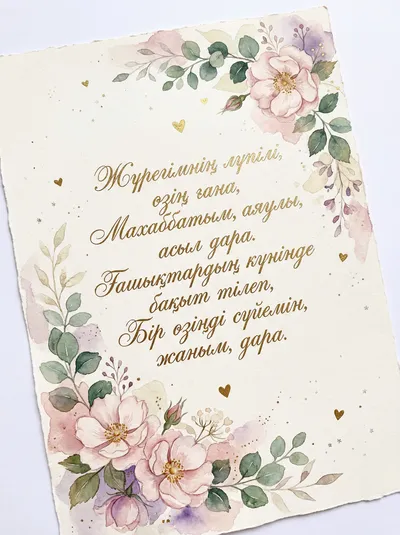 Жүрегімнің лүпілі өзің ғана, Махаббатым, аяулы асыл қана. Ғашықтардың күнінде бақыт тілеп, Сүйем сені, жан жарым, мәңгі дара. Аспандағы жұлдыздай жарқырай бер, Өмірімнің мәнісі болып қана.