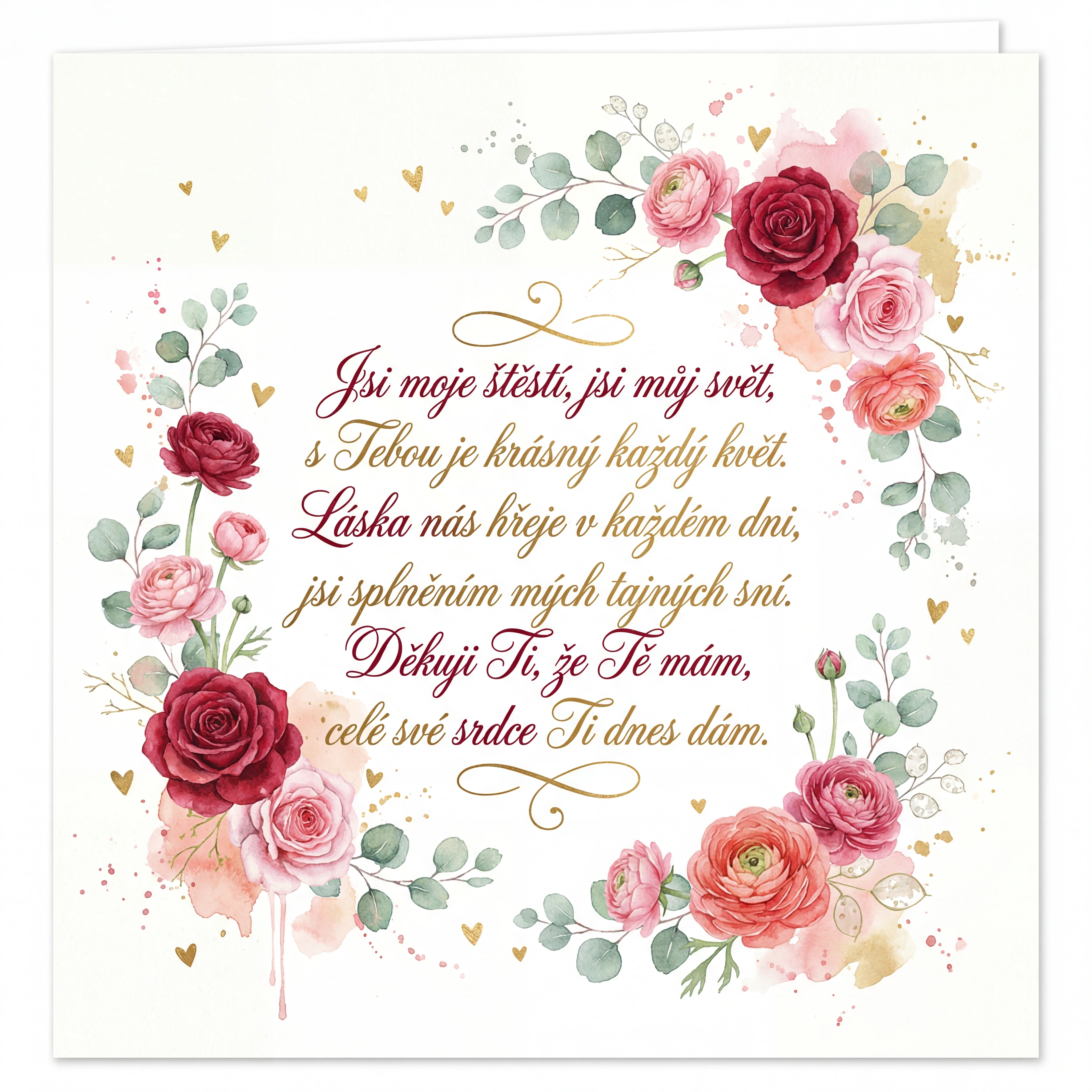 Jsi moje štěstí, jsi můj svět, s Tebou je krásný každý květ. Láska nás hřeje v každém dni, jsi splněním mých tajných sní. Děkuji Ti, že Tě mám, celé své srdce Ti dnes dám.