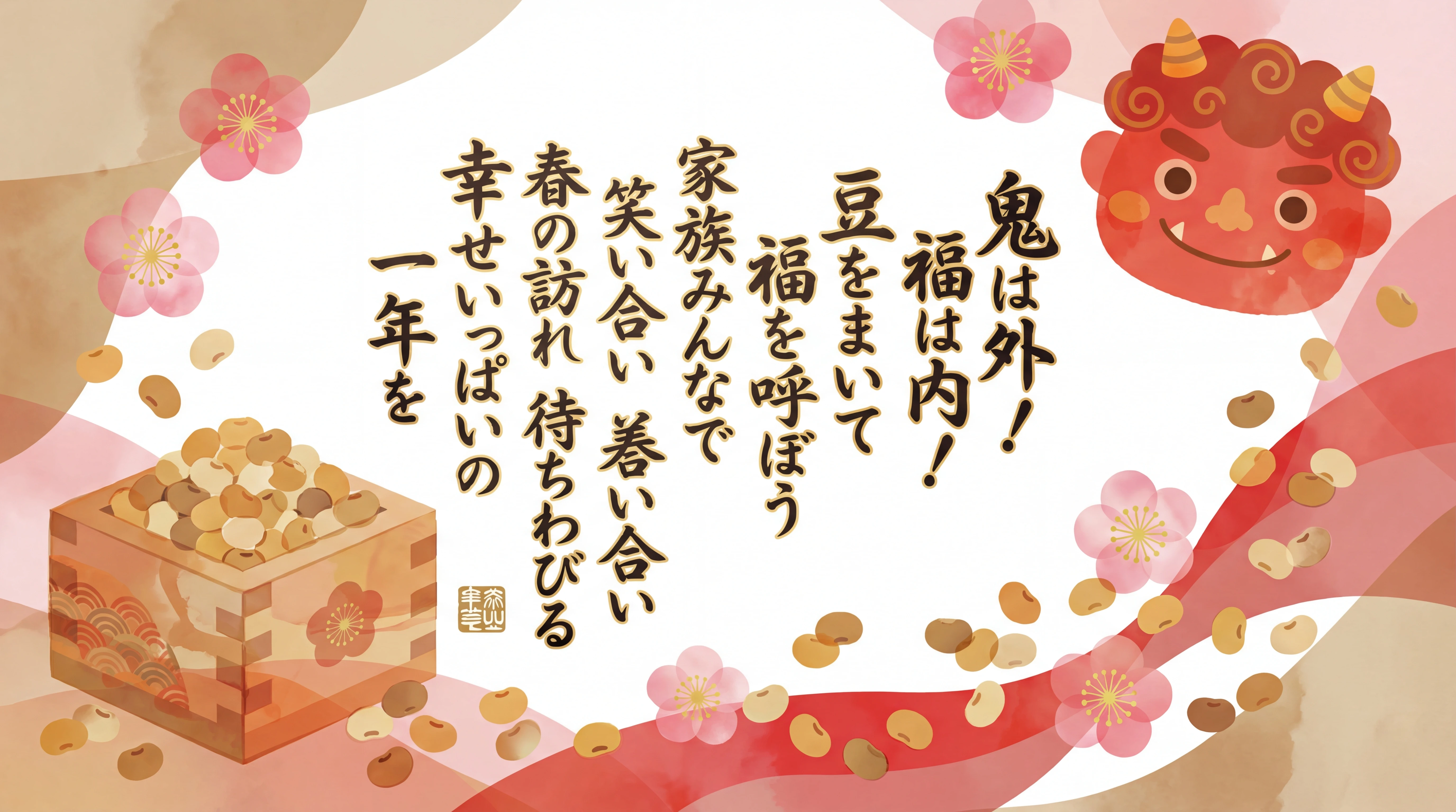 鬼は外! 福は内! 豆をまいて 福を呼ぼう 家族みんなで 笑い合い 春の訪れ 待ちわびる 幸せいっぱいの 一年を