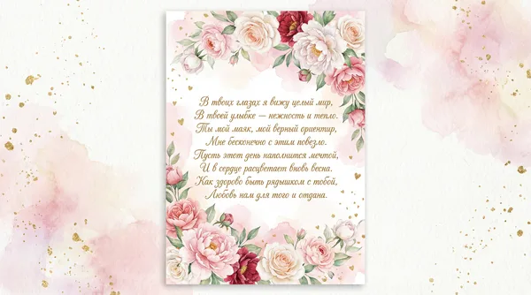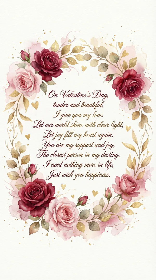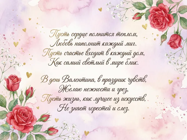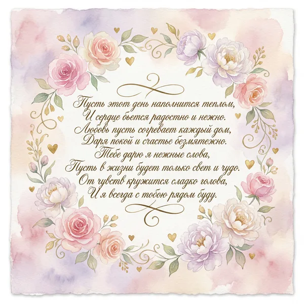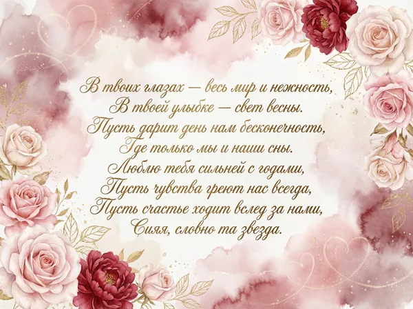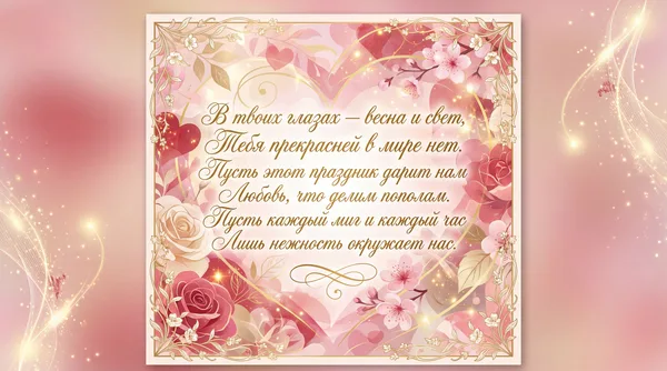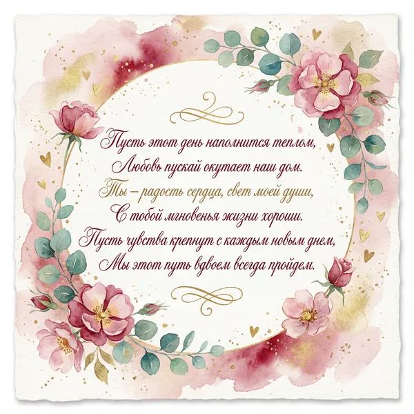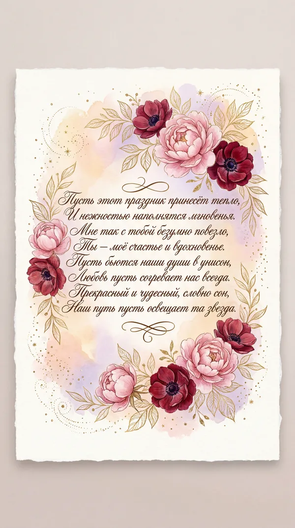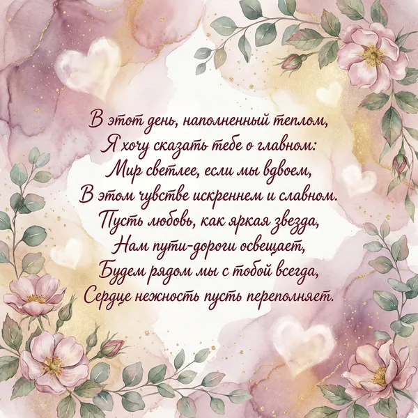 Пусть этот день наполнится теплом, Любовь пусть согревает наши души. Счастливым будет каждый миг вдвоем, Ты для меня — единственный и лучший. Пусть в сердце расцветают лишь цветы, И нежность наполняет каждый вечер. Прекрасней всех на свете — только ты, И я ценю любую нашу встречу.