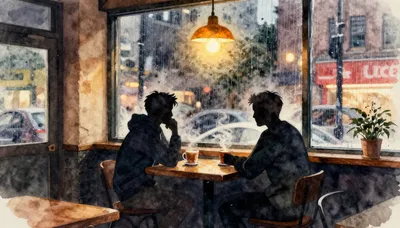 – Een warme en uitnodigende koffiebar met een stel bij het raam.
