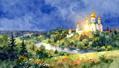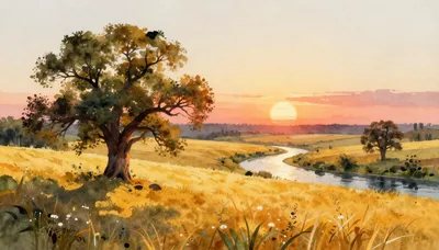 – Serene natuurlijke taferelen met velden, boomgaarden en rivieren bij zonsondergang.